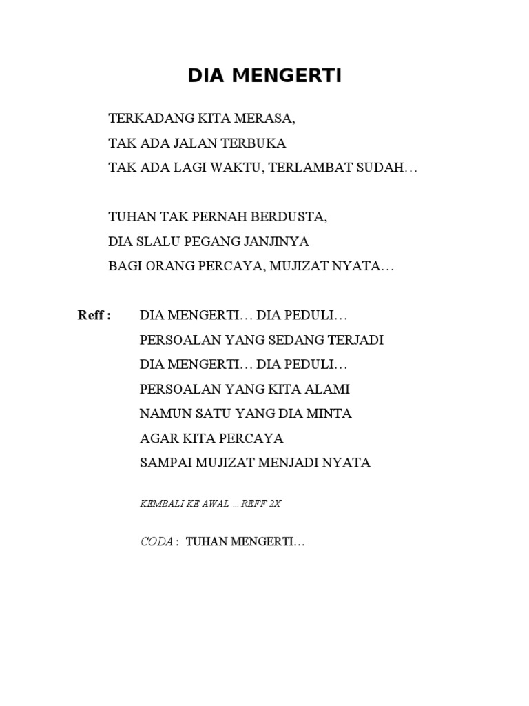 DIA MENGERTI DIA PEDULI PERSOALAN YANG KITA ALAMI NAMUN SATU YANG DIA MINTA AGAR KITA PERCAYA SAMPAI MUJIZAT MENJADI NYATA Lagu Dia Mengerti bisa juga dinyanyikan seperti yang ada di YouTube dengan mengetik judul lagu serta penyanyinya. D - Indonesian Indonesian Songs Tagged With. Tuhan tak pernah berdusta Dia slalu pegang janjiNYA Bagi orang percaya Mukjizat nyata.